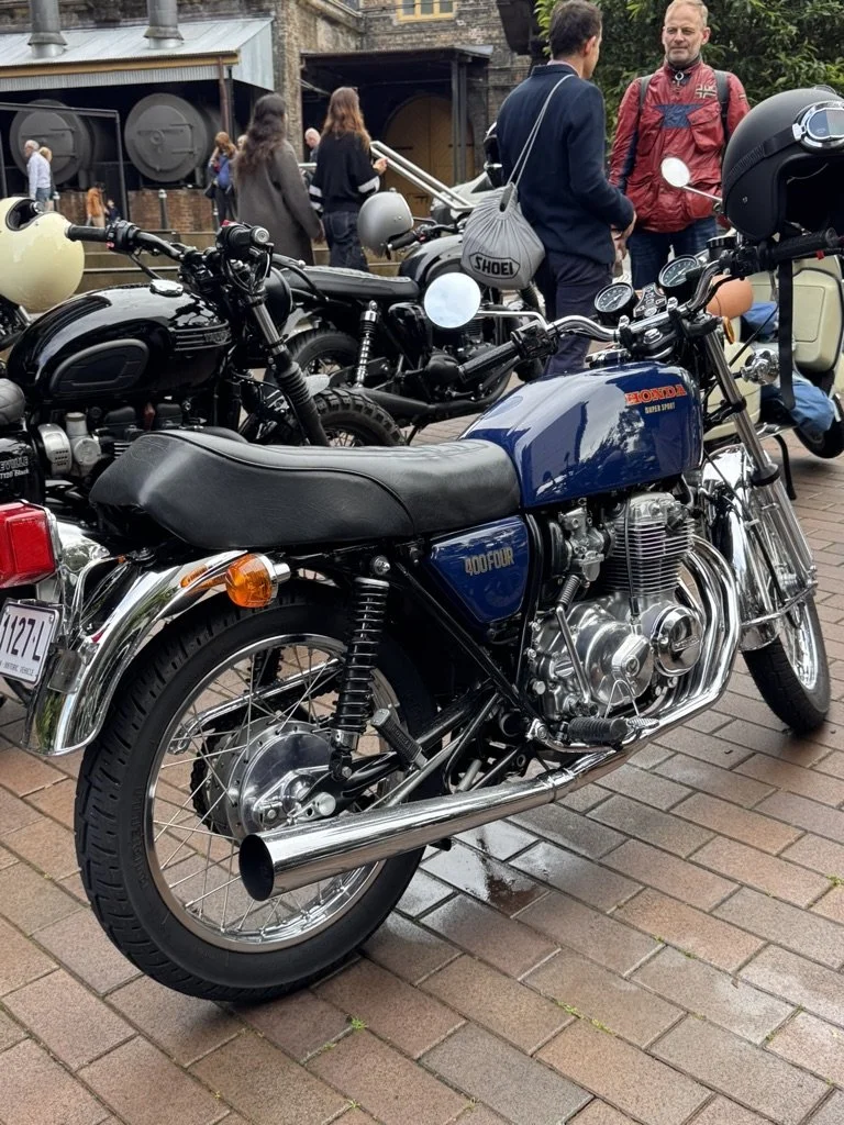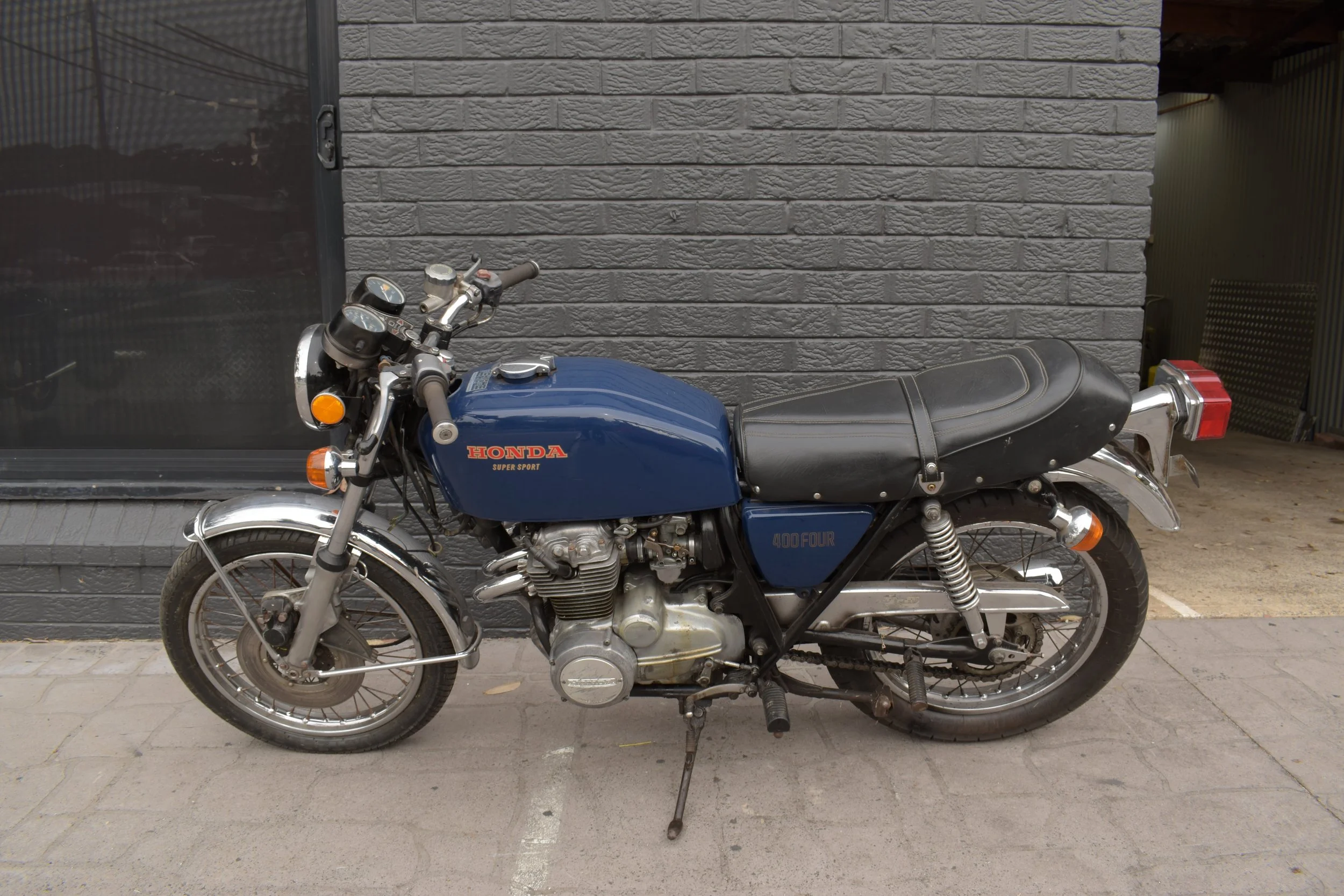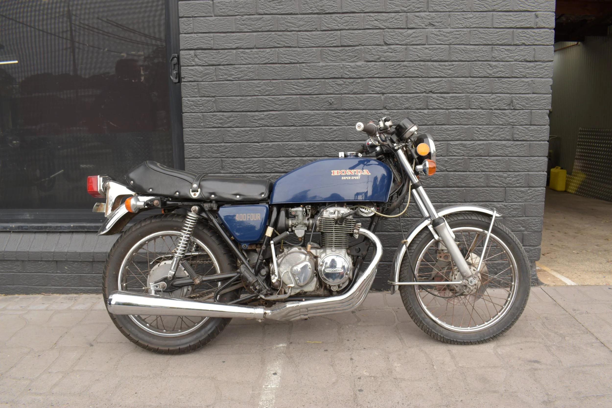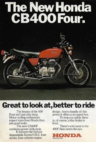 What the web says about the CB400F: The Honda CB400F, produced from 1975 to 1977, is a classic middleweight motorcycle that introduced a four-cylinder engine to the 400cc class. Powered by a 408cc air-cooled inline-four engine producing 37bhp, it featured a 6-speed transmission and distinctive four-into-one exhaust. Its café racer-inspired design, with low handlebars and rear-set footpegs, set it apart from contemporaries. (Wikipedia)
